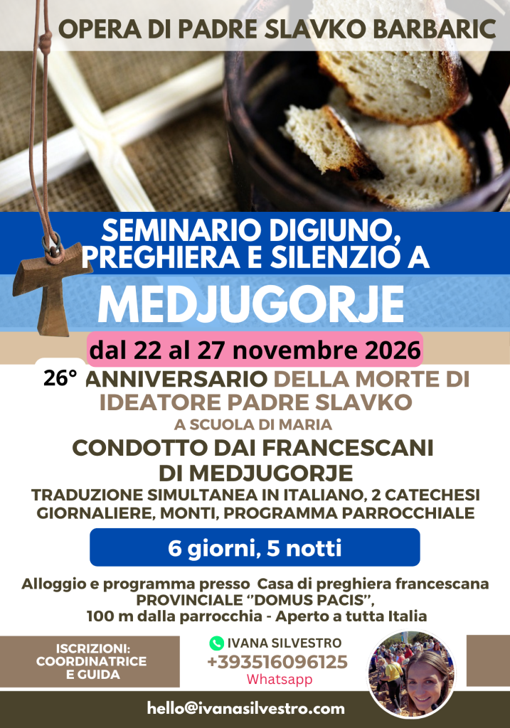 Chi è stato sa che clima di pace c’è a Medjugorje…Staremo nel silenzio interiore. Mangeremo il pane con la musica contemplativa. Silenzio è importante e vi sarà richiesto a mantenerlo durante tutta la giornata, anche durante i pasti.